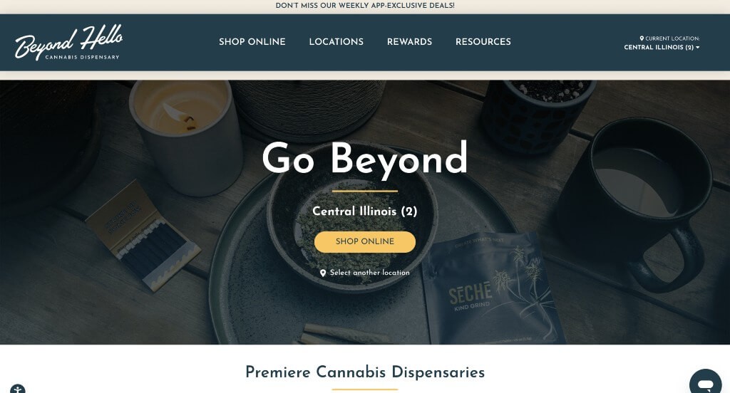 This is a great dispensary web design example for someone who is looking for a professional layout. After scrolling past the navigation of this dispensary site, you’ll notice the impressive color scheme. The well labeled navigation bar was another unique quality in this custom dispensary website we enjoyed. Beyond Hello clearly had digital marketing in mind when creating the domain for their website that matches their company’s name. Don’t forget to check this website out while looking through our list of the best dispensary sites!