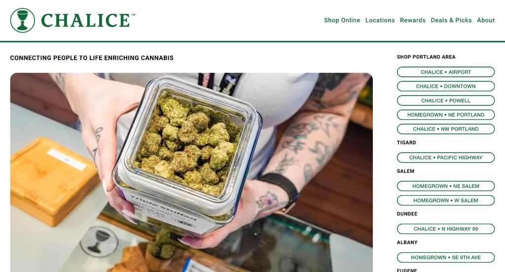 We chose Chalice Farms because of its nicely organized dispensary website that uses gray, black and white for a color scheme. The layout that was simple to navigate was likely the most impactful quality in the homepage of Chalice Farms. The addition of a blog was definitely refreshing for a unique dispensary website. From a marketing perspective, we really liked the way this dispensary website utilized well planned imagery. Talk about a great website to have included in this list of top websites!