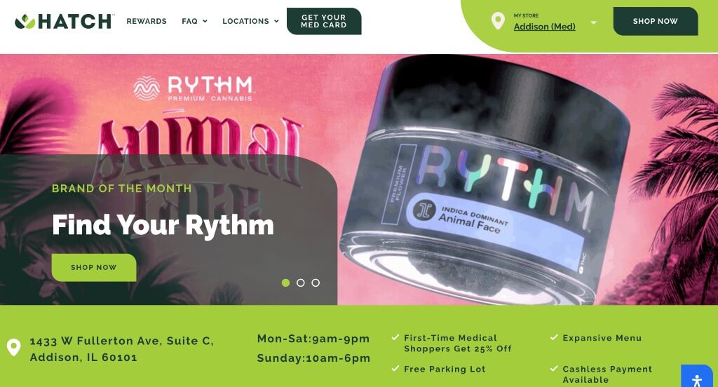 The HATCH website has a very classy feel to it, thanks to its blended use of white, black and green. After scrolling past the header of this dispensary site, you’ll immediately notice their use of curved color blocks. The use of different tones of green was a unique choice for a custom site. They had website accessibility in mind when designing the professional text for their website. Talk about a great website to have included in this list of top websites!