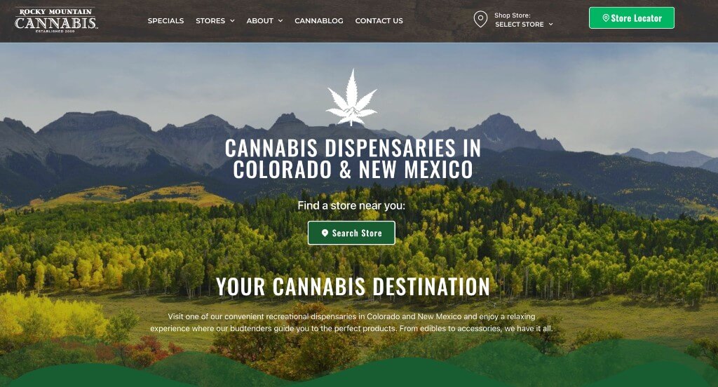 This is a good website example of a website design for dispensaries who are looking for a custom site layout. Of all the custom dispensary websites we reviewed, one of the features in this custom website we liked was the green accent. This clean dispensary site also does a good job with the creative graphics. Rocky Mountain Cannabis clearly had a focus on digital marketing when creating the textured background for their website. Don’t forget to check this website out while looking through our list of the best dispensary website layouts!