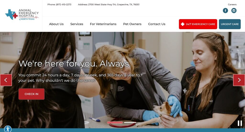 There were a lot of veterinarian sites to choose from, but the website of CountrySide Veterinary Clinic was a great example of a nicely organized website with a variety of colors for their color scheme. The creative logo design was definitely the most impactful feature in the homepage of CountrySide Veterinary Clinic. Another thoughtful quality in this clean veterinarian website was their layout that was free of distractions. CountrySide Veterinary Clinic clearly had website accessibility in mind when designing the simple buttons to call or make an appointment through their website. Don’t skip past this website when hunting for design ideas for your next veterinarian website!