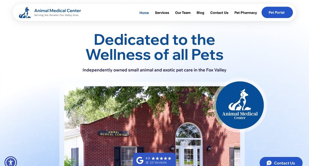 This is a good example of a veterinarian website design for someone searching for a professional website design idea. After scrolling past the navigation of this veterinarian website, you’ll notice their interesting logo design. Their thoughtful template was a unique choice for a custom site. They had digital marketing in mind when creating the graphics spread throughout their website. What a great website to review when building out your next website!