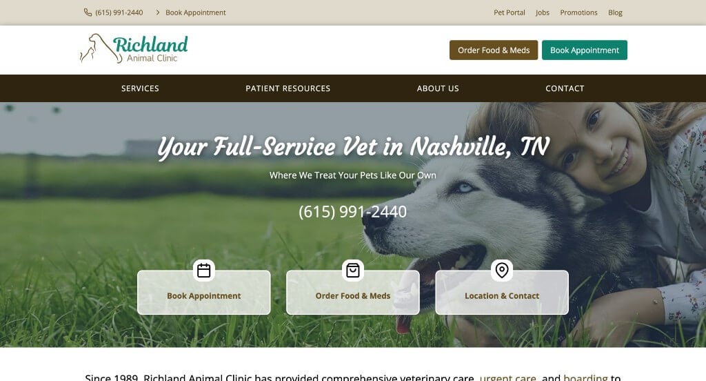 This is a good example of a website design for veterinarians who are looking for a custom site design. After scrolling past the header of this veterinarian website, you’ll immediately notice the accented blue color. The use of buttons throughout their site was a nice touch for a professional site. They clearly had a focus on website marketing when building the simple contact information for their website. Don’t skip past this website when hunting for design ideas for your next veterinarian website!