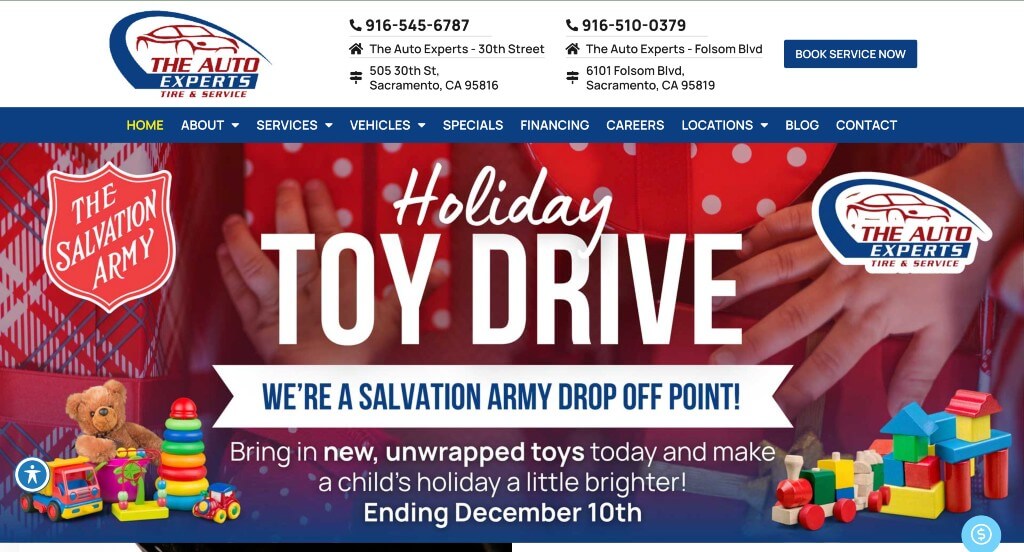 This website shows their priorities when offering a 10 dollar discount for your next service if you sign up for text message alerts. Other features highlighted right away are warranty, shuttle service, coupons, phone number, and a button to schedule an appointment. We also enjoyed the variety of blue colors used in their palette. Adding in images and vehicle models was something we won’t forget.