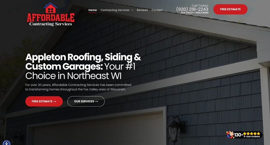 Enhanced by a vibrant website design, Affordable Contracting Services effectively conveys their core focus: delivering top-notch custom home builds and residential remodels. The structured 5-step process outlines the client journey with transparency. A dynamic color scheme adds to the visual appeal, while the judicious use of clear and engaging images enhances the overall aesthetic. The platform also stands out for its attention to convenience, as evidenced by the intuitive contact form that simplifies communication. This commitment to seamless engagement is further underscored by the presence of contact details in strategic locations across the website, cementing Affordable Contracting Services’ dedication to providing an accessible and visually pleasing experience.