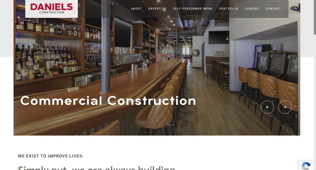 This example contractor website right away shows the projects that they offer. Keeping the site simple with pictures and a green color scheme. At the bottom of the page, they share testimonials from pleased customers to help potential customers. They do a good job of separating commercial and residential.