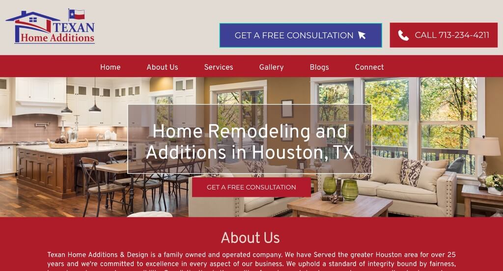The color scheme used in this example was brilliant because it shows state pride. Additionally, these images are stunning so customers will want to reimagine their home looking like that. Short paragraphs are a great way to go for content because readers stay engaged for a longer amount of time if they are only reading the essentials. Including their awards and recognitions also helped them to build trust with their clients.