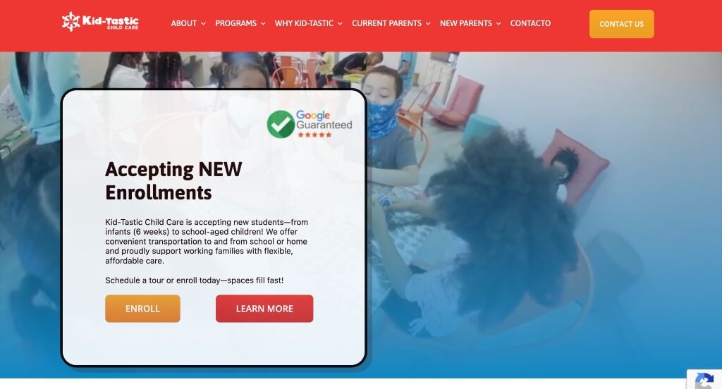 Kid-Tastic is very straightforward daycare website design with lots of information. Having short and to the point paragraphs really helped us when considering placing this company on our list of best child care website designs. As a company, standing out from competitors is something Kid-Tastic clearly wants. Lastly, we thought it was helpful to have client testimonials.