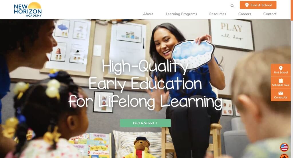 Discovery World’s website design is very simple. White space is well balanced along with images and written content. In this design, they are good at adding in links allowing for customers to reach out if they want more information. Discovery World Learning Center establishes why you should choose them along with awards they’ve won. We also really liked their creative fonts that add to the overall design.