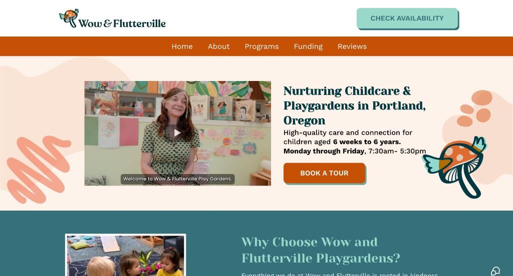 Right away, we enjoyed the theme seen throughout this company’s web design. This theme can be seen by their bright colors, stunning flower graphics, and flower frames. They showcase 30 years in business among other statistics which builds trust with potential customers. It was an interesting feature to include both parent and children testimonials.