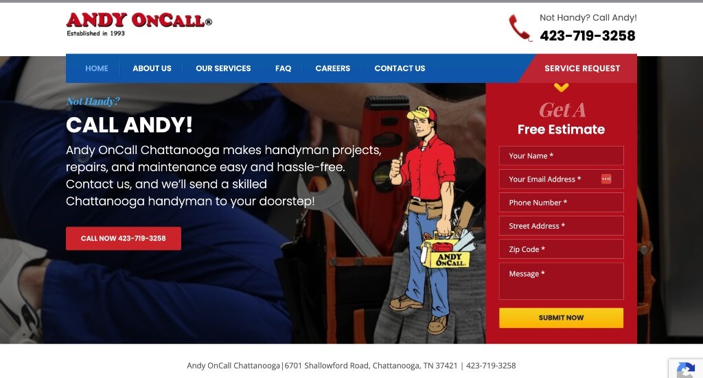 Right away, we see that Andy OnCall has a catchy slogan, presented in red. This website uses a creative font to creates an impression of hand painted letters, helping to develop a strong sense of branding through visuals. It’s very easy to contact this company with a few different links placed in the homepage and a sticky header including a contact page.