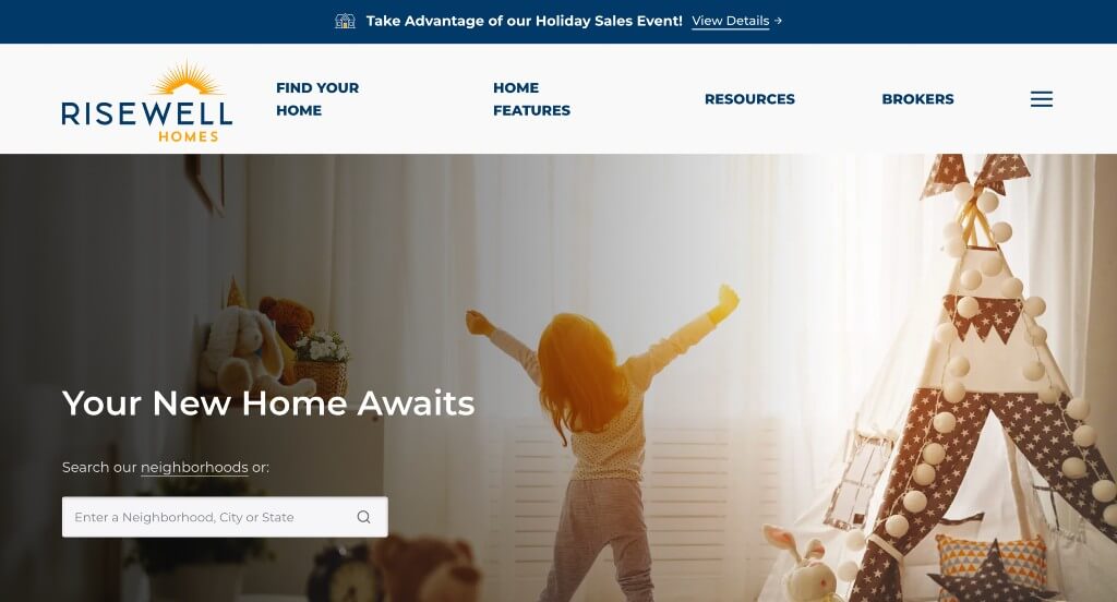 This company grabbed our attention with their large image used for their hero header. Additionally, their logo made sense for their business without being too complex. We liked their seemingly handwritten fonts that appear as their titles. Including different communities they are selling homes in or typically build homes in was a great choice.