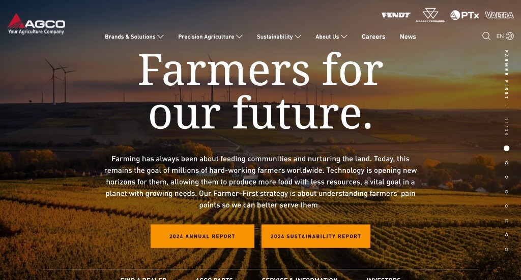 AGCO’s website has a relatively large banner that showcases a high quality images with links to different pages denoted with a red button. This red color is used in quite a few places throughout to bring attention to certain areas. You might also see a section dedicated to news and media explaining them as a company, building trust with customers. We also noticed that their menu is well labeled with organized drop down bars for each section.