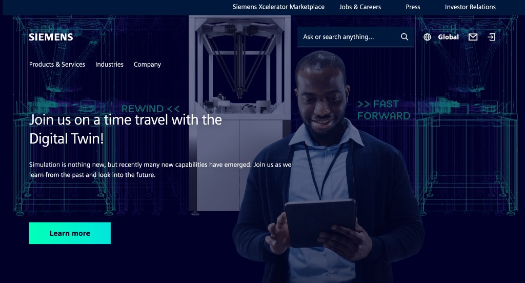 Likely the most noticeable part in this layout was their contrasting color scheme – a navy blue background, with bright cyan or lime colored links and accents. It was helpful to have all their important pages clearly linked to their homepage, making it easier to navigate. Siemens also did a great job choosing their domain name because it matches their company name. Their navigation bar was also clearly labeled, which is always a plus.
