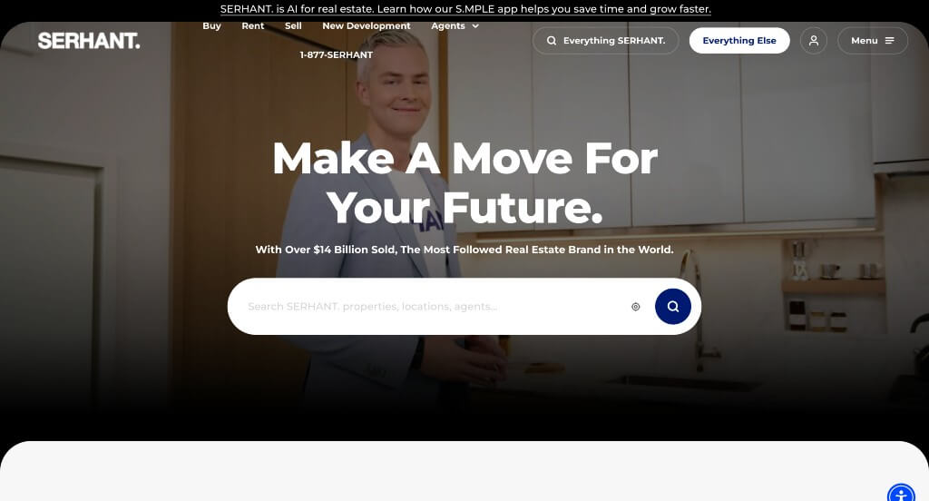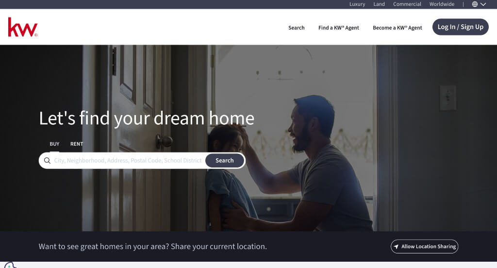 Realogics Sotheby’s International is another great example, with its very simple design including a search bar, property listing pictures, news, and what’s popular. Offered by this company is also a sign-in option allowing visitors to save houses and much more. Also included in here is a live chat, search bar, and many ways to connect with them through social media links.