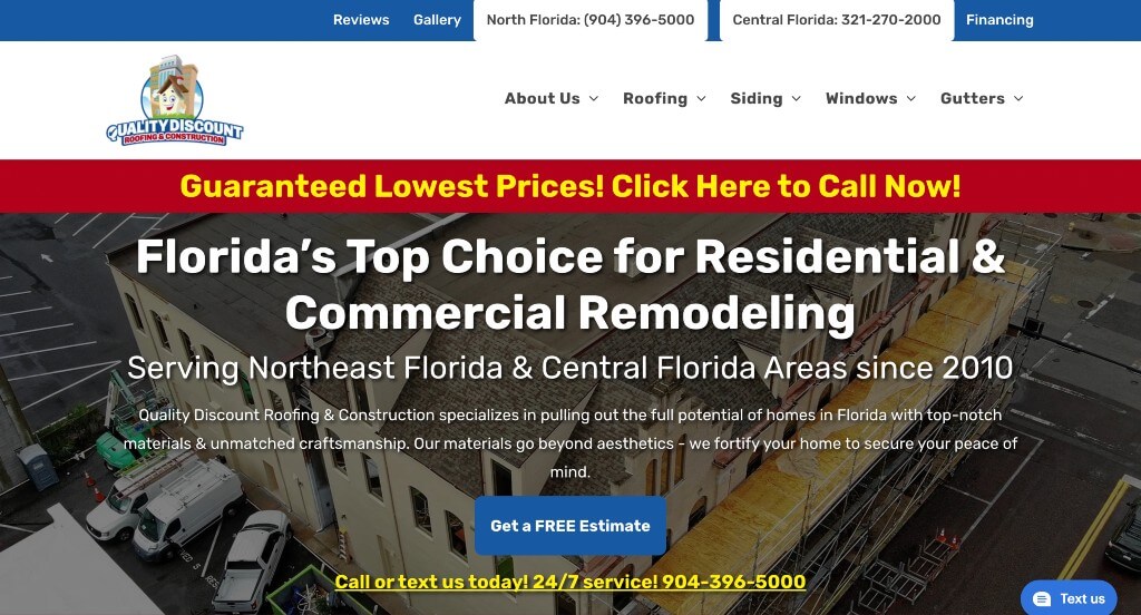 Quality Discount’s website does a great job of highlight what services they offer in the intro slider. They get that information out to the potential customer right away. Throughout the homepage, there are many hover effects, which when you hover over them you can receive in-depth information. The testimonials are on a slider, which is easy to read. Also, they offer a free estimate, financing, and a live chat.