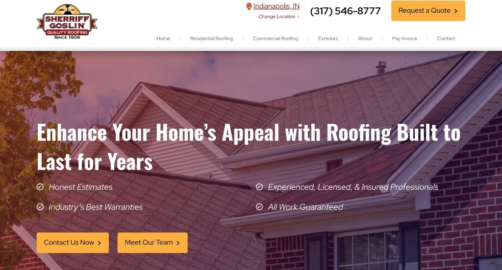This website uses colors that aren’t often used with other roofing websites. Many visuals on the homepage showcasing the services they offer and the types of shingles that they offer. Also, a good amount of written text and links to more information. This allows the potential customer to get a lot of questions answers by just looking through the company’s information.