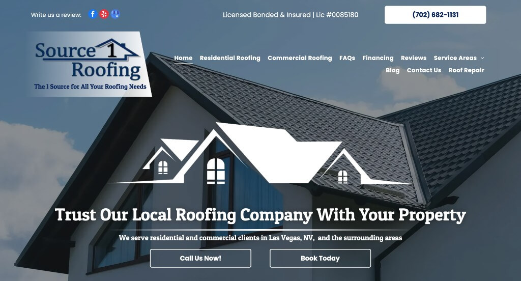 Source 1 Roofing showcases a short video right off the bat, getting a lot of information out the view all in one place. Each service has a picture and a link to learn more. Also, plenty of reviews from happy customers are shared on the homepage.