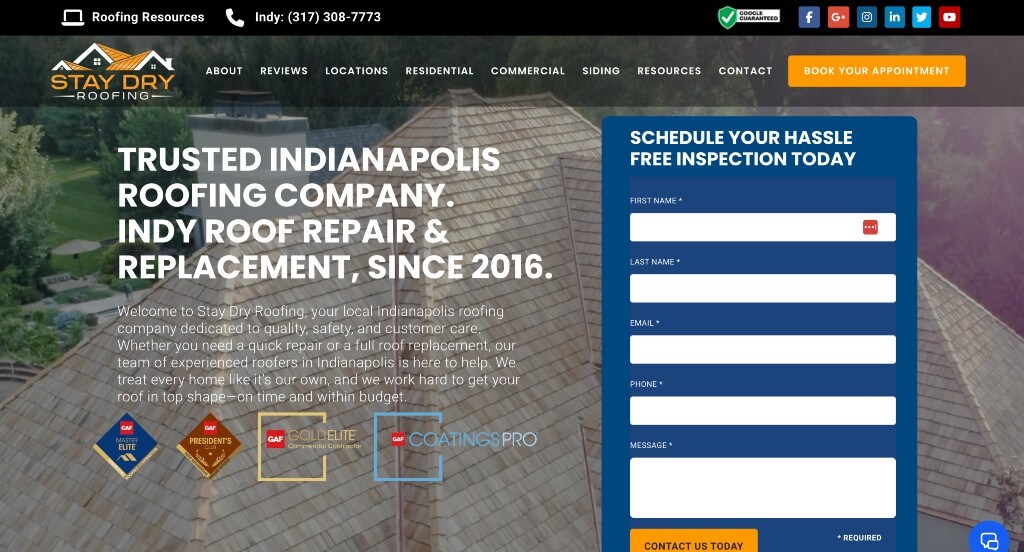 Stay Dry Roofing has a user-friendly navigation menu that shows the potential customer all the things they can do. The website also features an informative blog that shows the latest information and showing pointing to that this company is a roofing expert. A very nice Google map showing all of their locations.