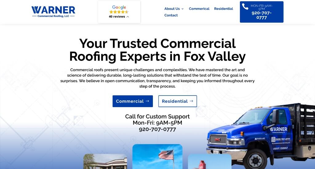 This roofing website is a great example of a site that wants to get its information out in the easiest way possible. There are many video clips throughout the website. Also, a good amount of images highlight important sections of the site. The videos help the potential customer get a better idea of the company. There are also social media links, live chat, and an organized menu separating their commercial and residential work.