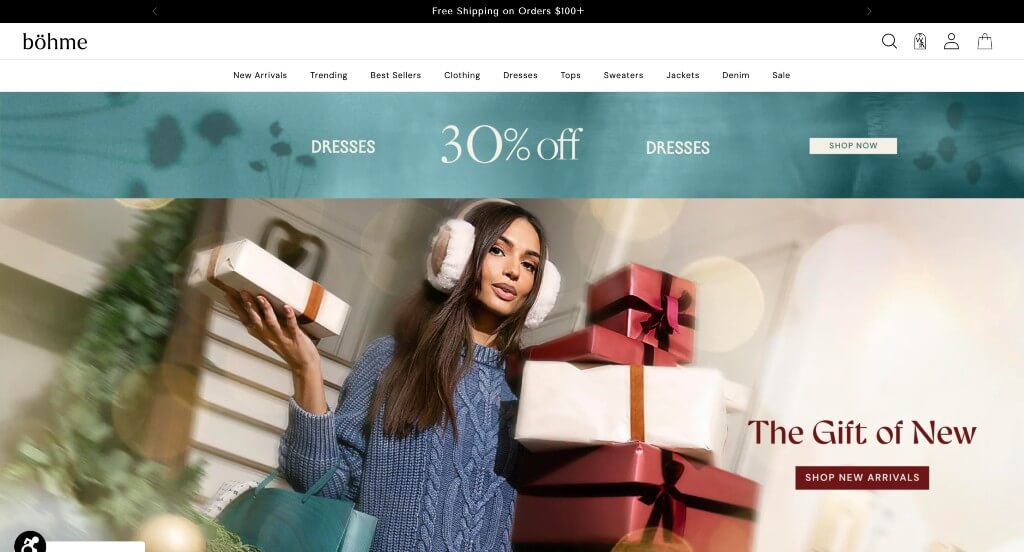 Bohme is a clothing retailer that specializes in bohemian-style clothing and accessories. Stunning images with beautiful backgrounds was a great choice. We loved their simplistic font choices and color scheme. Including images that match the upcoming season was perfect. It was helpful to include a navigation bar with lots of tabs to help customers get to the information they need.