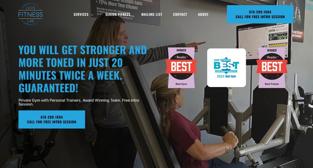 This example was a great way to start out our collection of personal trainers because of their bright colors used throughout the page. Along with that, we really liked how this company used bold fonts to grab the attention of viewers. Adding in these interesting geometric patterns was another thing that would for sure stand out to viewers.