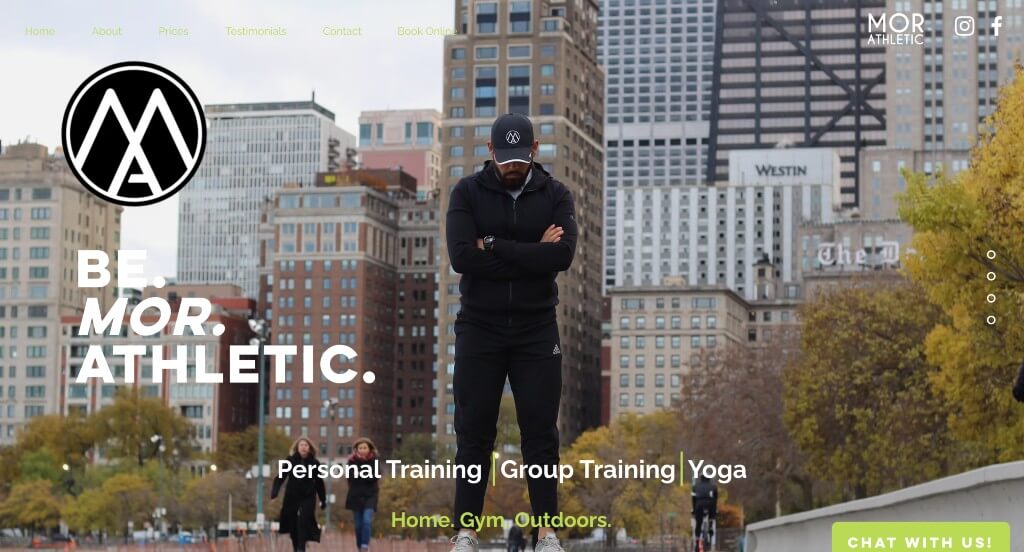Here is a more modern design for a fitness trainer, but that is why we liked it. The color palette is simple with bursts of lime green to grab attention of viewers. Their organization of text was another thing that we really appreciated because it made it easy to find what you might be looking for or to skim through content. Having buttons right away to view prices and book now was another smart decision.