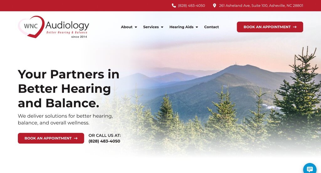 This is a great web design example for audiologists who are looking for a professional website. The simple color scheme was probably the most impactful quality in the homepage of this website. Another thoughtful quality in this creative audiologist website was the variety of information in their site. They had conversions in mind when creating the review page for their website. Be sure to consider the unique design of this audiology website when developing your next website.