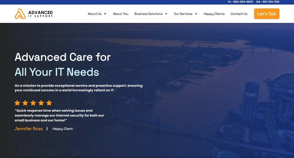 This is a good example of a computer repair website design to check out when looking for inspiration for a professional looking website. After scrolling past the header of this computer repair website, you’ll immediately notice their template that was free of distractions. The addition of a blog was another thoughtful feature in this professional computer repair site we enjoyed. They had digital marketing in mind when designing the well-labeled navigation bar for their website. Don’t forget to check this website out while looking through our list of the best computer repair websites!