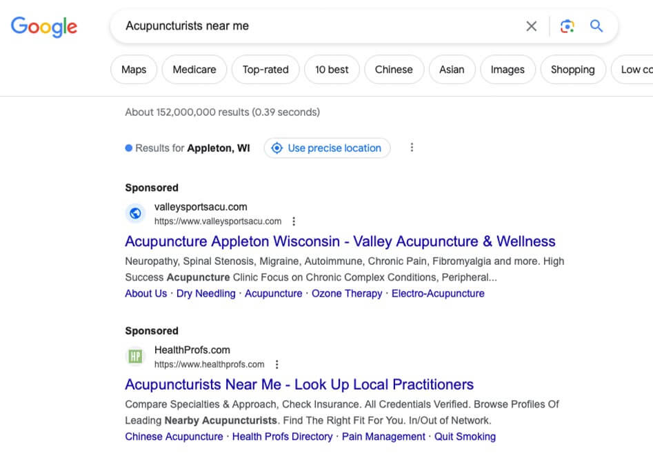 - Keyword-Targeted Campaigns: Set up keyword-targeted campaigns to appear in search results when users search for specific terms related to acupuncture, such as “acupuncture near me,” “stress relief acupuncture,” or “pain management through acupuncture.” By targeting relevant keywords, you ensure that your ads reach individuals actively seeking acupuncture services, increasing the likelihood of attracting potential clients.