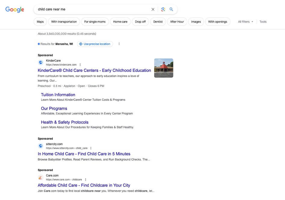 - Targeted Paid Advertising for Local Parents: Use targeted paid advertising campaigns on platforms like Google Ads and social media to reach potential parents in your local area. By showing relevant ads to parents searching for child care services nearby, you can drive more qualified traffic to your website and increase inquiries.