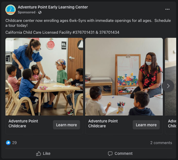 - Virtual Tour Experience: Use social media ads to offer virtual tour experiences of your childcare facility. Utilize video or interactive content to showcase your classrooms, play areas, and safety measures. This allows parents to explore your childcare center from the comfort of their homes, creating a sense of familiarity and confidence in your services.