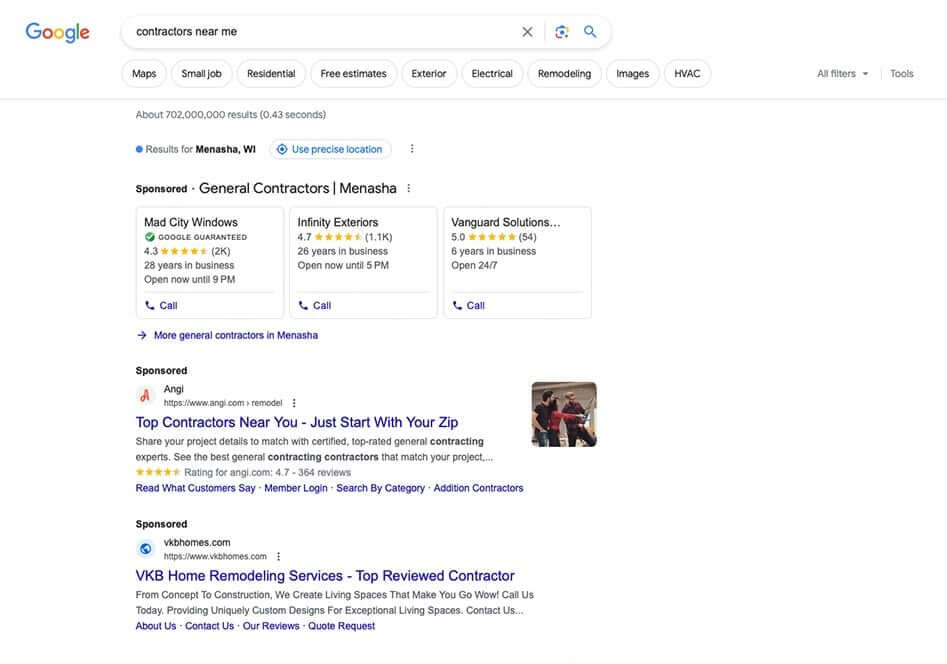 - Local Service Promotion: Create search ads targeted at your local area to promote your contracting services. When people in your community search for terms like “contractors near me” or “local construction companies,” your ad can appear at the top of search results, increasing your visibility to potential customers looking for contractors in their vicinity.