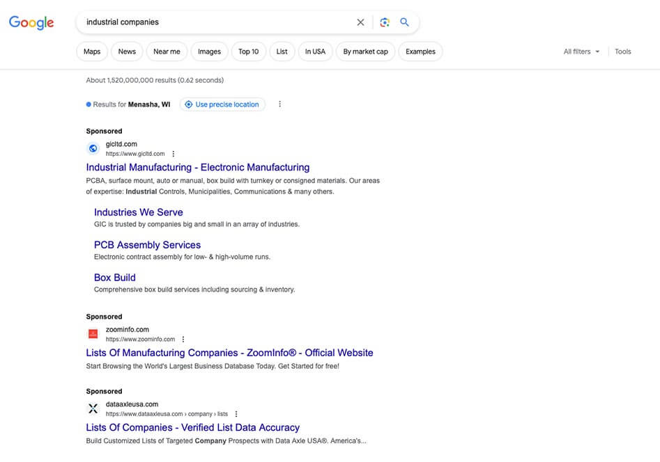 - Local Industrial Services: Create search ads targeting your local area to promote your industrial services. When people in your target location search for terms like “industrial services near me” or “local industrial contractors,” your ad can appear at the top of search results, increasing your visibility to potential customers seeking industrial solutions in their vicinity.