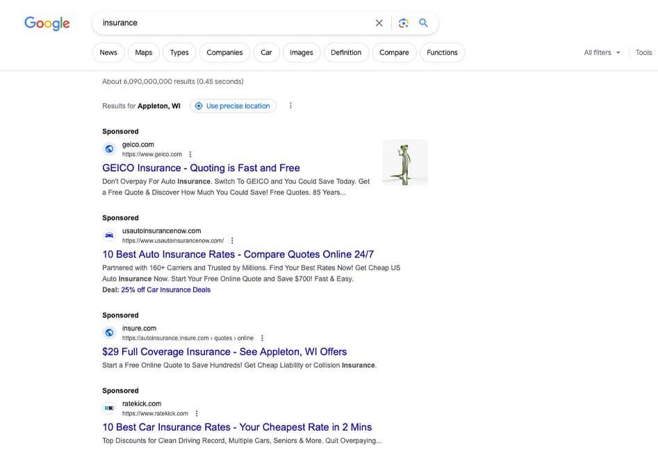 - Local Insurance Services: Create search ads targeting your local area to promote your insurance services. When people in your target location search for terms like “insurance companies near me” or “local insurance agents,” your ad can appear at the top of search results, increasing your visibility to potential customers seeking insurance coverage in their vicinity.