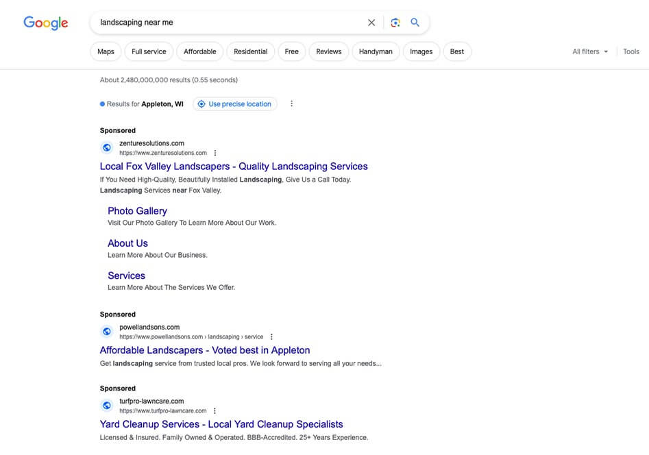 - Local Landscaping Services: Create search ads targeting your local area to promote your landscaping services. When people in your vicinity search for terms like “landscaping contractors near me” or “local landscape design,” your ad can appear at the top of search results, increasing your visibility to potential customers seeking professional landscaping assistance in their area.