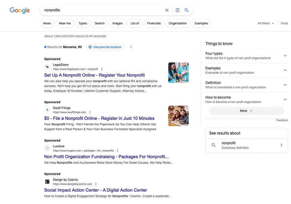 Search advertising can be a highly effective strategy to promote your non profit’s mission and connect with potential donors and volunteers who share your passion for making a positive impact. By utilizing search ads, you can reach individuals actively searching for ways to support charitable causes, making your organization more visible and increasing engagement. Below are five examples of how search advertising can benefit your non profit organization and help you achieve your philanthropic goals: