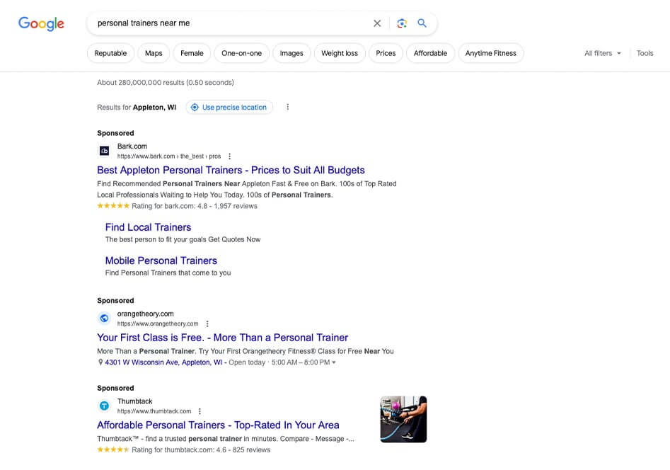 - Local Personal Training Services: Create search ads targeting your local area to promote your personal training services. When people in your vicinity search for terms like “personal trainers near me” or “local fitness coaches,” your ad can appear at the top of search results, increasing your visibility to potential clients seeking personal training in their community. This strategy allows you to attract more local leads and generate new training sessions.