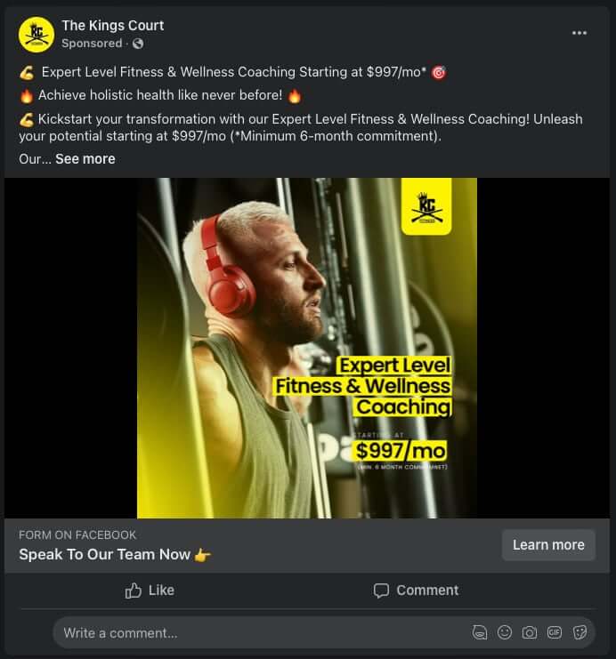- Personalized Training Packages: Tailor social media ads to promote personalized training packages based on individual goals and fitness levels. Use targeting options to reach users who have engaged with fitness-related content and have shown interest in specific fitness activities, such as yoga or weightlifting. Highlighting personalized training options can demonstrate your ability to meet individual needs, increasing the likelihood of attracting clients seeking customized fitness programs.