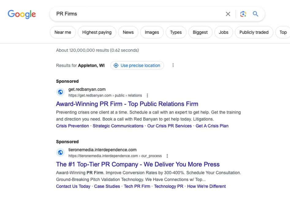 - Industry-Specific PR Services: Run search ads targeting keywords related to specific industries or niches, such as “tech PR firm” or “healthcare public relations experts.” This strategy allows you to reach businesses looking for PR firms with industry-specific knowledge. Showcase your experience in working with clients in the relevant industry and your understanding of their unique PR needs.