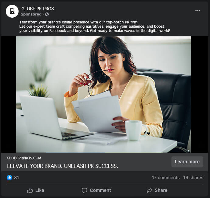 - Showcasing Success Stories: Create social media ads that highlight successful PR campaigns you have executed for your clients. Use compelling visuals and engaging copy to showcase the results you achieved, such as media coverage, increased brand visibility, or improved reputation. Target industry-specific audiences to attract potential clients who can relate to your previous success in their niche.