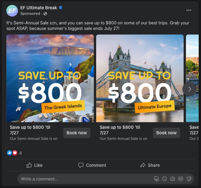 - Promote Travel Packages: Use social media ads to showcase your travel packages and deals. For instance, you can create ads featuring images and videos of popular destinations, accommodations, and activities included in the package to entice potential travelers.