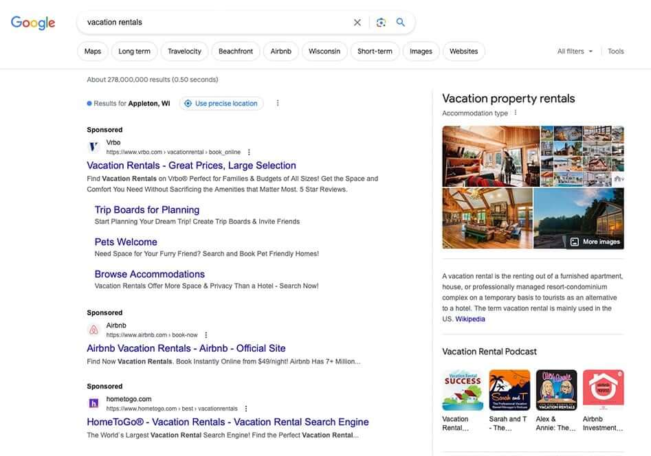 - Location-Specific Ads: Create search ads targeting keywords like “vacation rentals in [destination]” or “beachfront rentals in [destination].” This will ensure that your properties appear at the top of search results when travelers are looking for accommodations in specific locations.