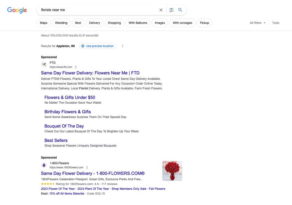 - Local Flower Delivery: Create search ads targeting your local area to promote your flower delivery services. When people in your community search for terms like “florist near me” or “local flower delivery,” your ad can appear at the top of search results, increasing your visibility to potential customers looking to send beautiful flowers to their loved ones.