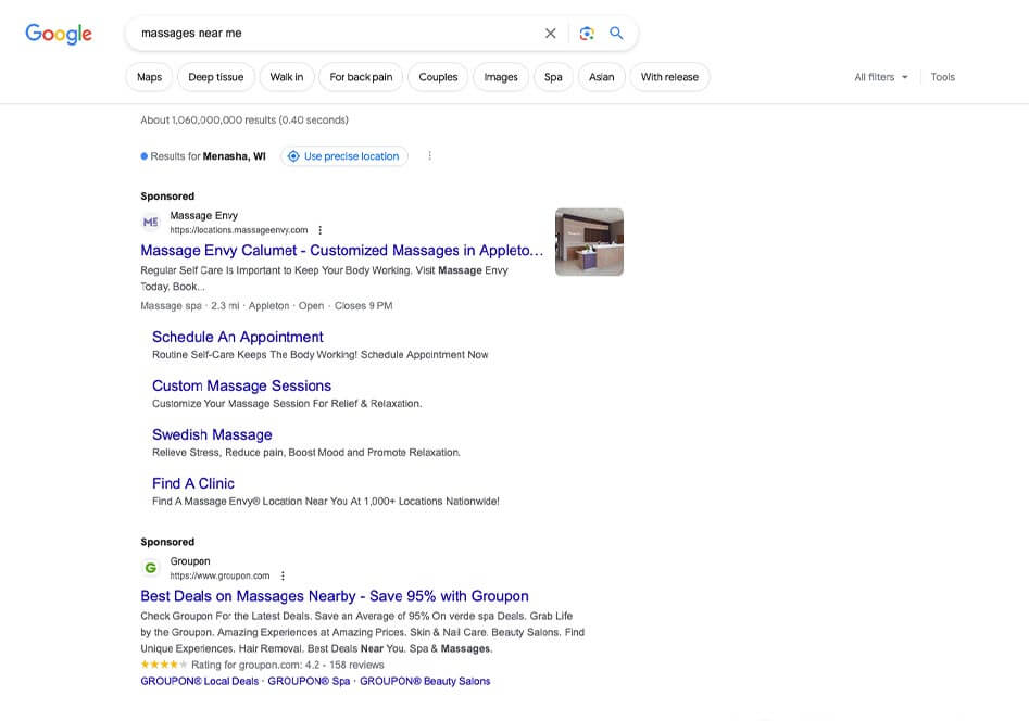 - Local Massage Therapy Services: Create search ads targeting your local area to promote your massage therapy services. When people in your vicinity search for terms like “massage therapist near me” or “local massage spa,” your ad can appear at the top of search results, increasing your visibility to potential clients seeking relaxation and stress relief in their community.